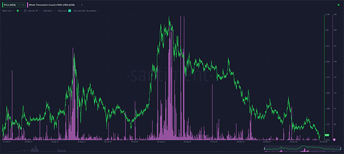 Otra métrica en la que se fijará Santiment es el recuento de transacciones de ballenas. El número de transacciones por valor de 100.000 dólares o más puede ser un buen indicador de la evolución de los precios. Los aumentos masivos de las transacciones de ballenas suelen ser señal de grandes picos o de mínimos. En estos momentos, ADA es un tema candente.