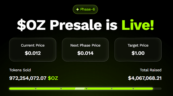 Unlike SHIB, Ozak AI isn’t just a community-driven hype play—it’s a tech-powered project with real-world use cases. Having raised over $4 million and sold more than 970 million tokens, Ozak AI is already attracting significant whale accumulation in the OZ presale phase. Its strength comes from partnerships with Perceptron Network and SINT, which connect it to more than 700,000 AI nodes.