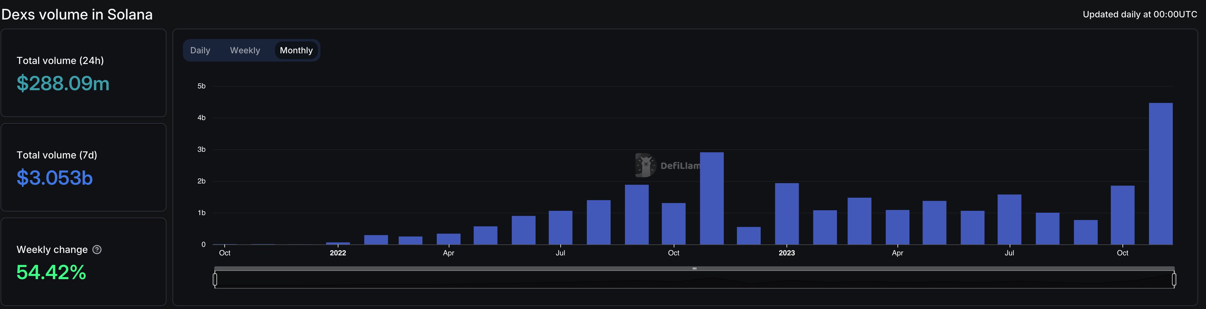 DEXs on Solana recorded a monthly volume of $5.1 billion in November, as per DefiLlama, exceeding the previous peak of $2.8 billion in November 2022. (This positive trend in decentralized exchange usage extends beyond Solana, as DEX usage across the broader crypto ecosystem has been on the rise since mid-September. They have handled over $26 billion—the highest since March earlier this year.)