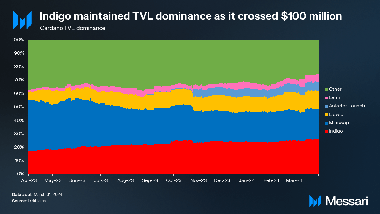 Much of the TVL growth in the past year was driven by newer protocols. Synthetic asset-issuer Indigo is the oldest and largest of these new (launched in the past year or so) protocols. It managed to dethrone Minswap in Q4, ending Minswap’s multi-year reign as the TVL leader. In Q1, Indigo remained the TVL leader.