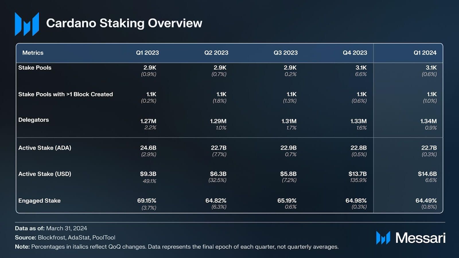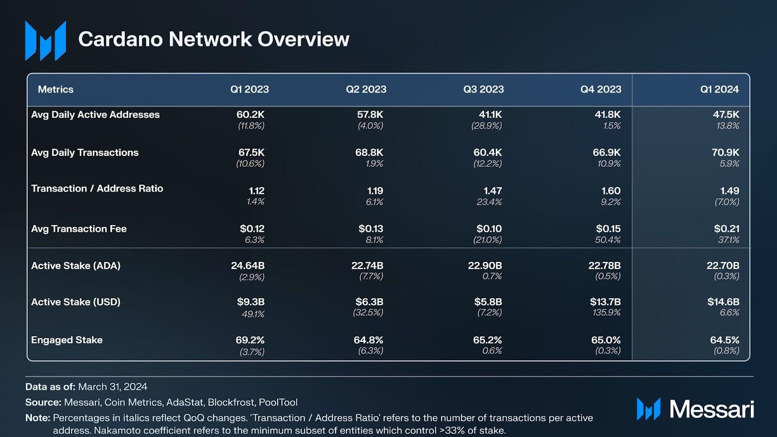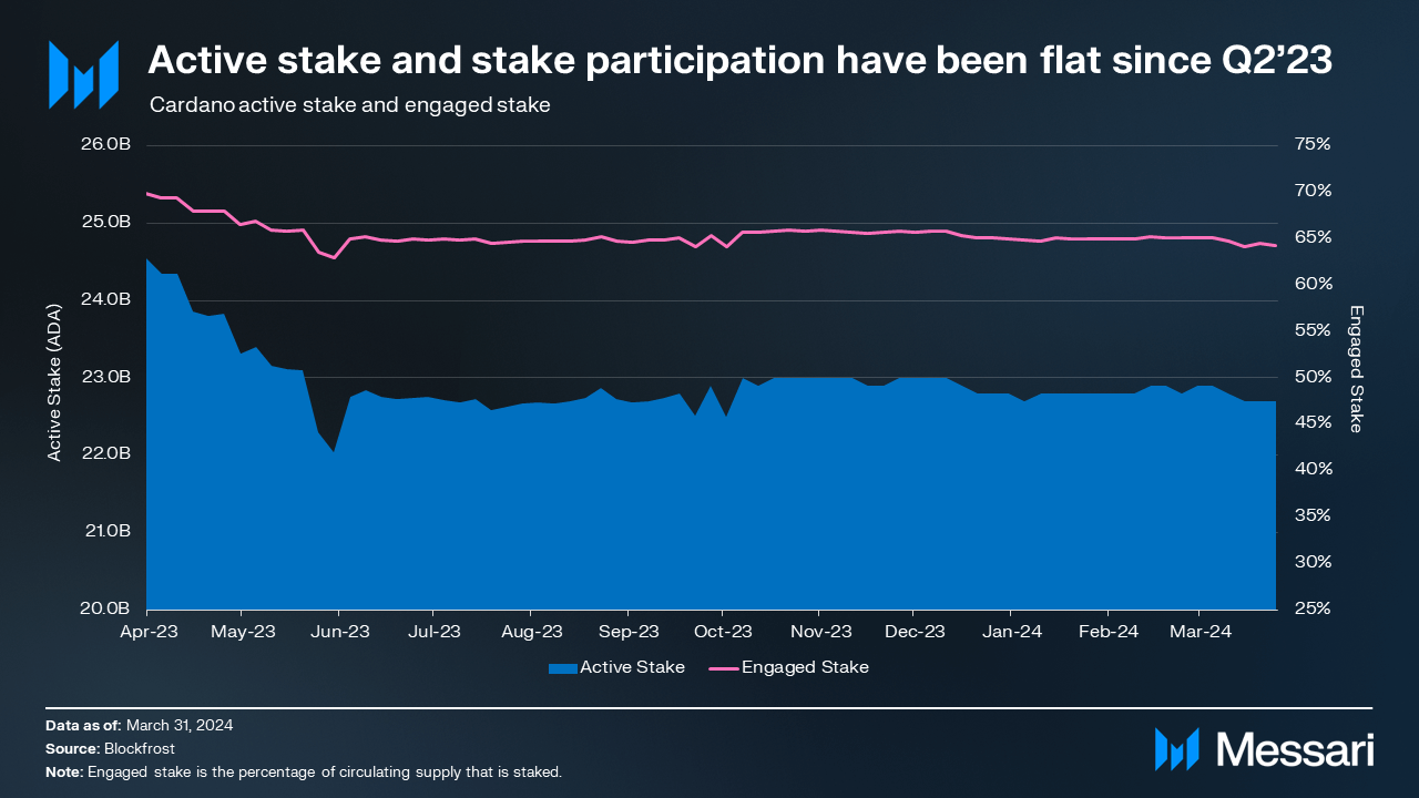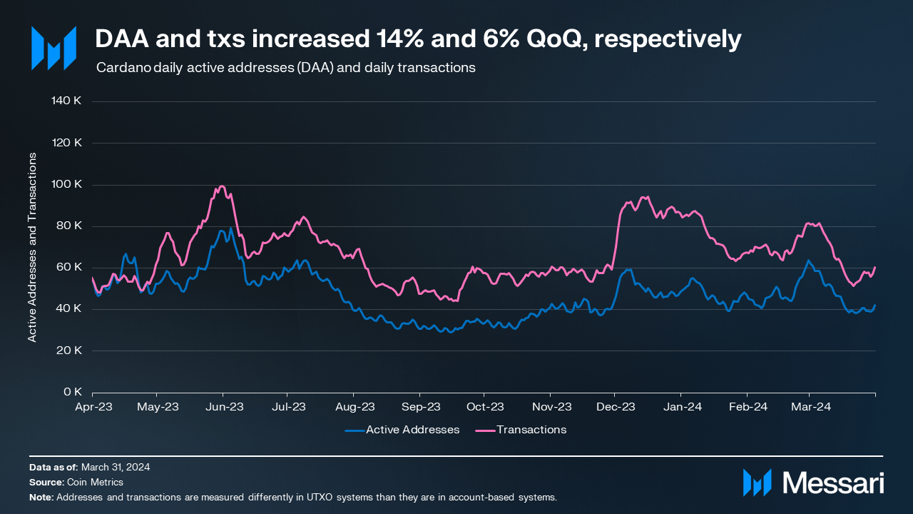 Relative to other networks, Cardano’s stablecoin market cap rank moved down from 32nd to 37th in Q1 2024, although still up from 54th in the start of 2023. Stable assets are ideal for pairing in liquidity pools, borrowing and lending, creating leverage, and providing quick escapes from volatility — all of which are quite common in the crypto market.