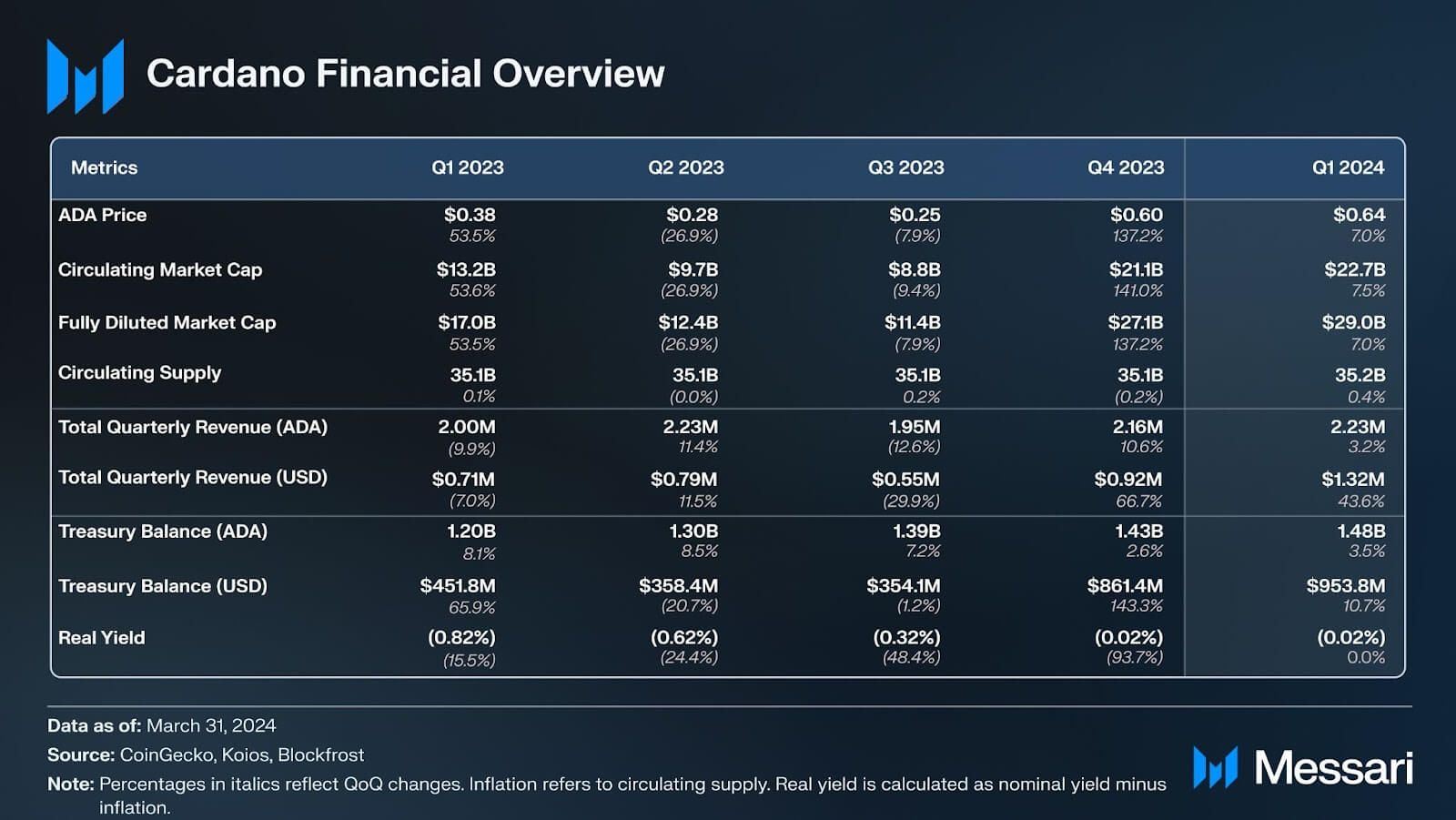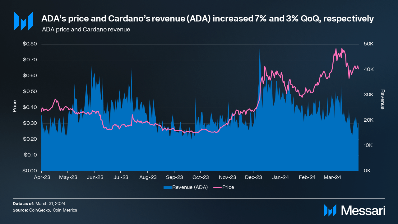 Cardano’s revenue (USD) increased 44% QoQ. This was partially driven by ADA’s 7% QoQ price increase.