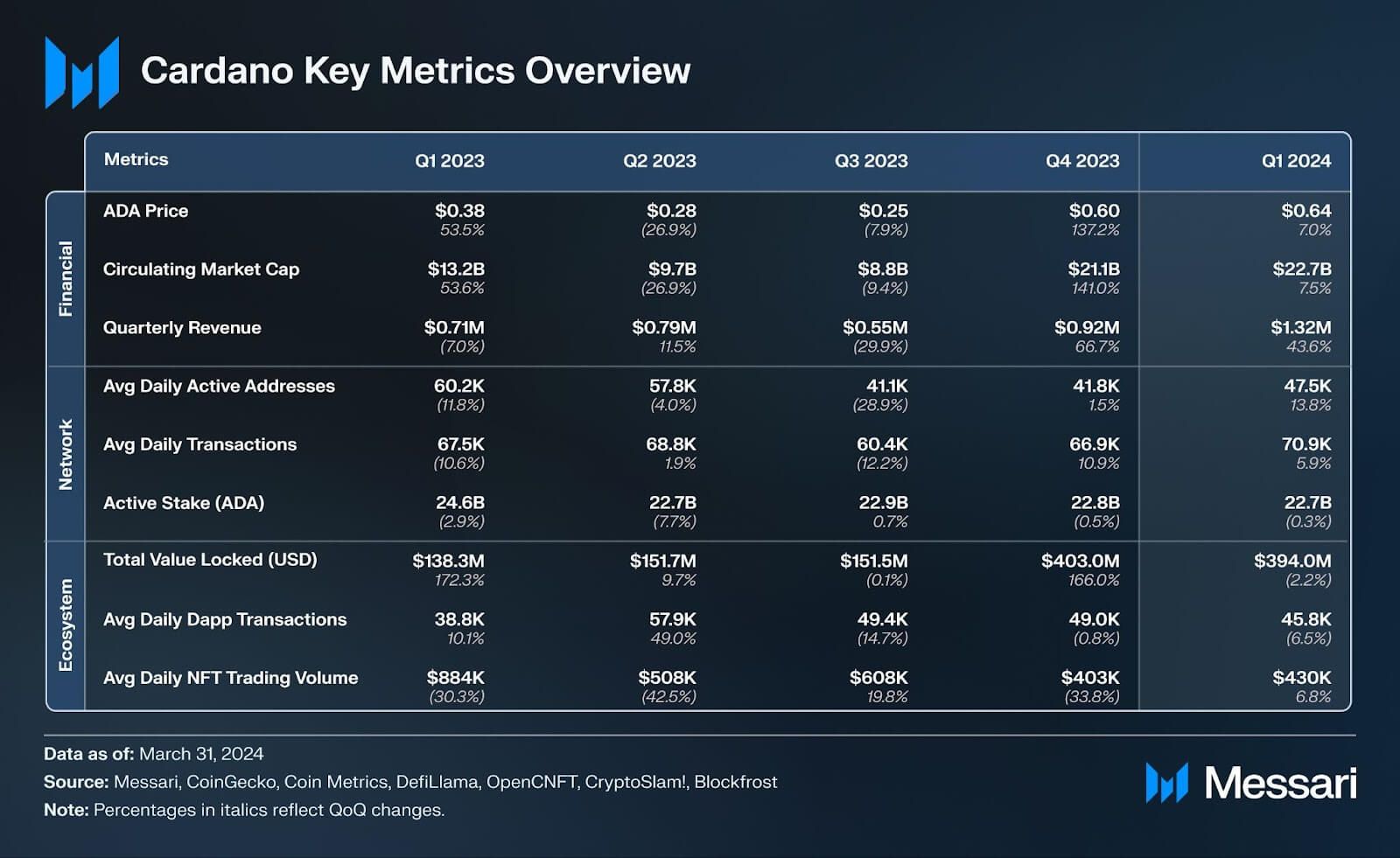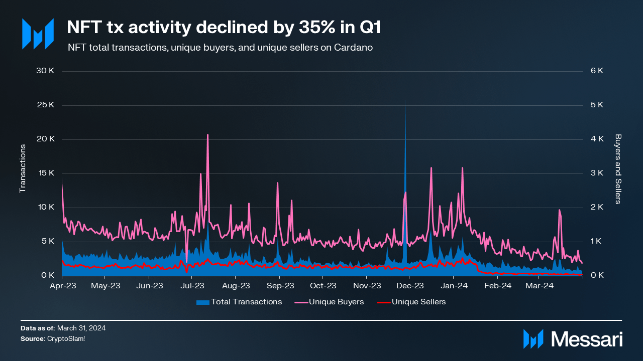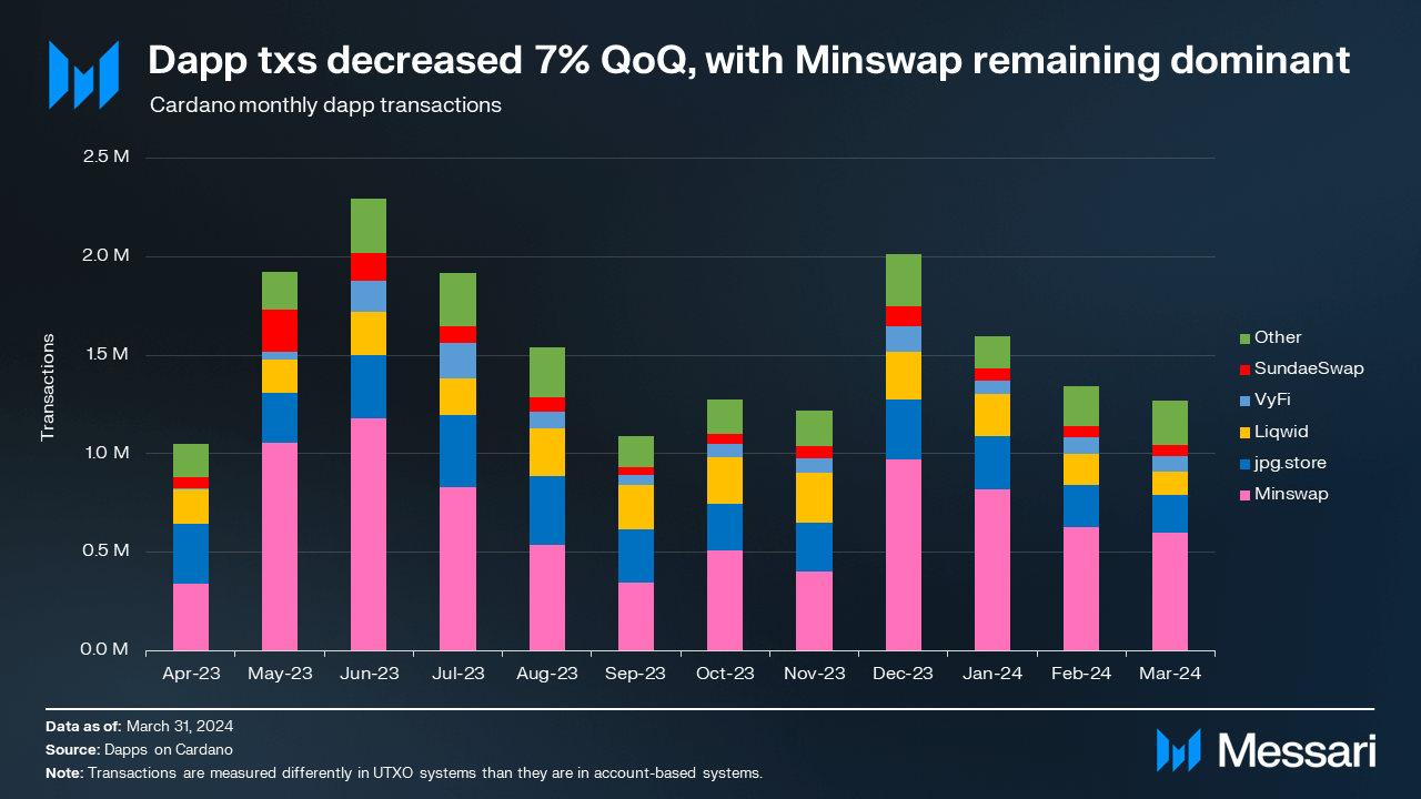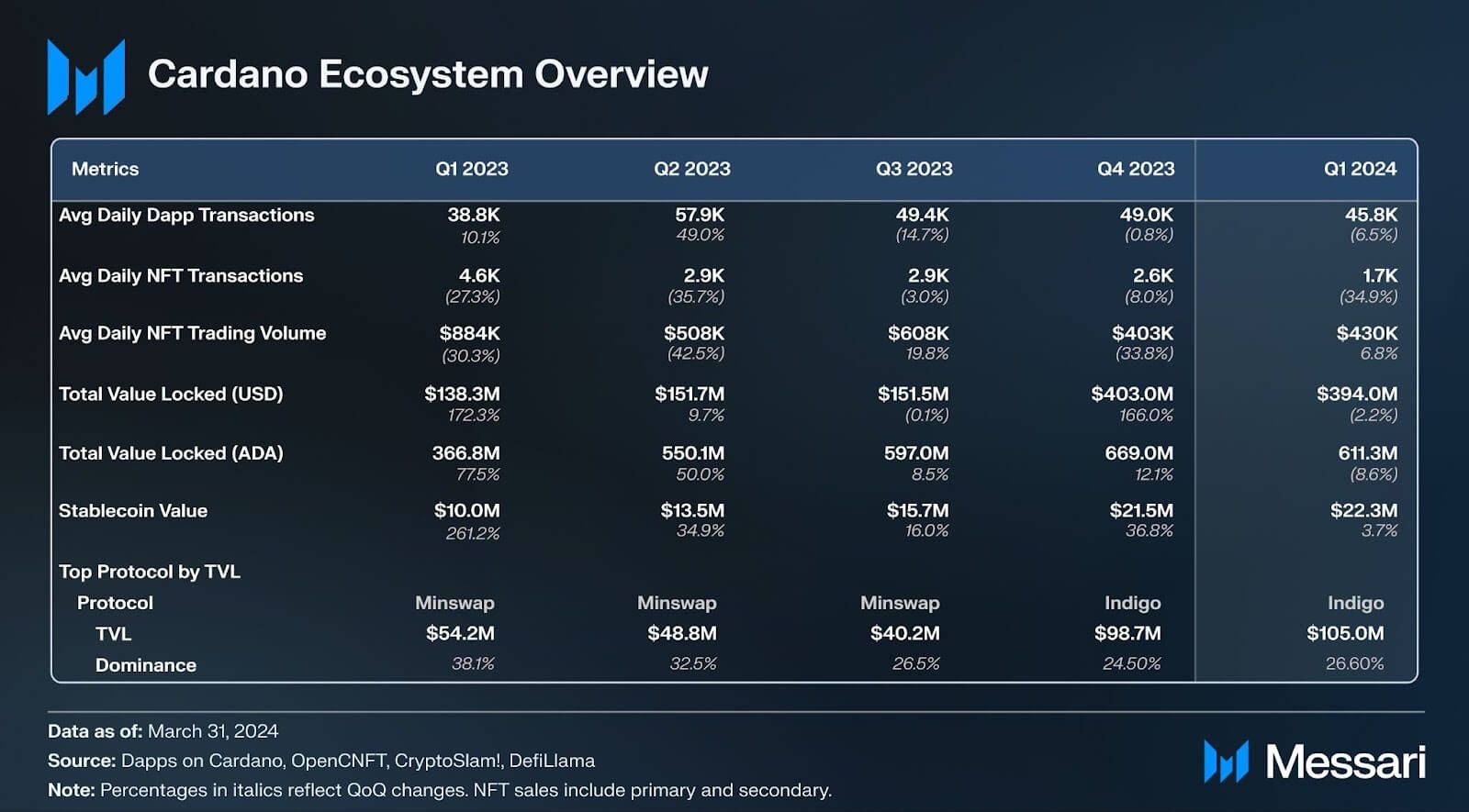 The Cardano ecosystem was mixed in Q1, with some sectors growing and others pulling back.