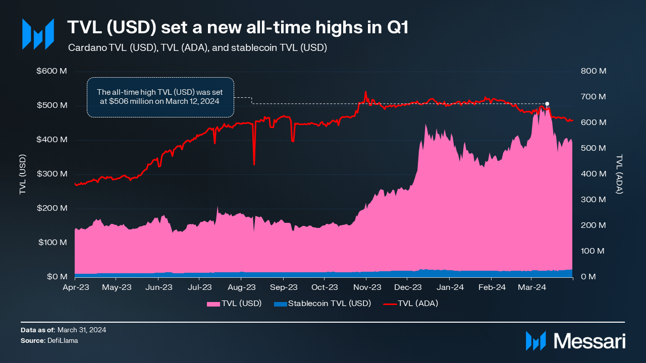 - TVL (USD) surpassed $500 million in March, setting an all-time high. Several new protocols launched or are nearing production, such as Axo and USDM, while incumbents continued to grow, such as Indigo and Minswap.
