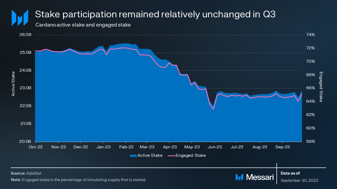 Active stake grew slightly, up 0.7% QoQ to 22.9 billion ADA. Also, engaged stake grew 0.8% QoQ to 65.3%.