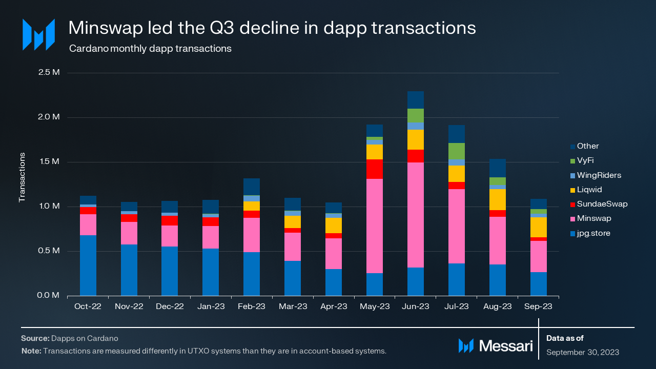 Minswap, an automated market maker (AMM), was the most popular Cardano dapp by transactions in Q3 for the second quarter in a row. Minswap remained the most-used dapp despite its 33.5% QoQ decline in transactions. Minswap’s in-development Stableswap feature may help the protocol drive even more activity by providing minimal slippage and more efficient trading.
