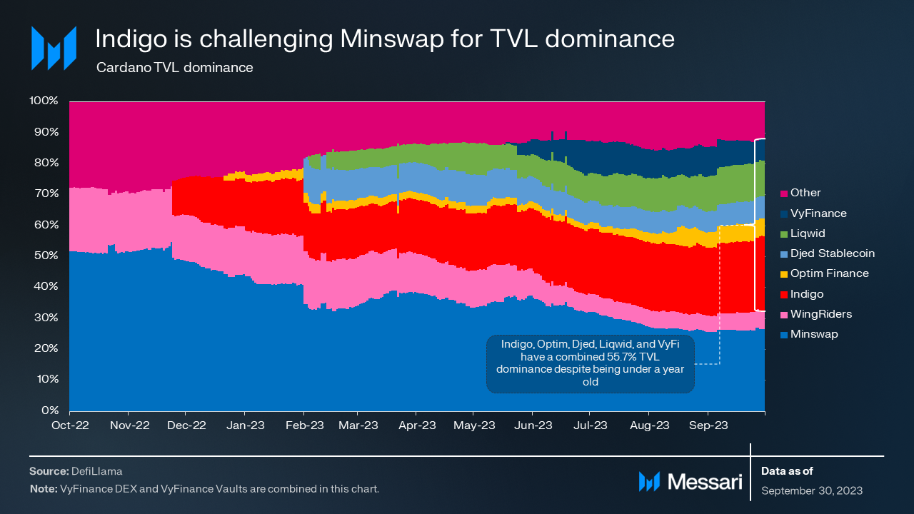Much of the 2023 TVL growth was driven by newer protocols. As of the end of Q3, 55.7% of TVL has come from protocols launched within the last year. Synthetic asset-issuer Indigo is the oldest and largest of these new protocols, ending the quarter challenging Minswap for overall TVL dominance. Indigo’s $36.8 million in TVL was not far behind Minswap’s $40.2 million.