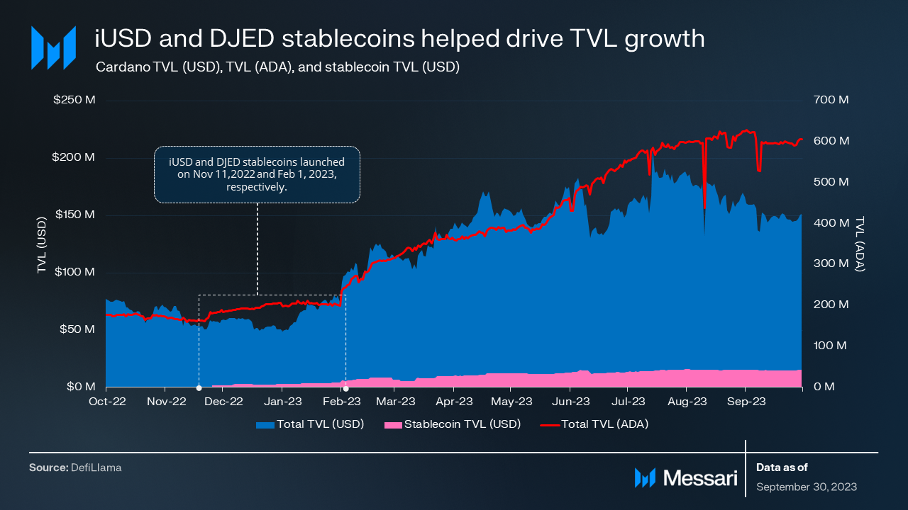 The launch of two new stablecoins, iUSD and DJED, in the past year proved to be a major catalyst for overall TVL. The total stablecoin market cap grew 16.3% QoQ from $13.5 million to $15.7 million. Relative to other networks, Cardano’s stablecoin market cap moved up from 54th to 32nd in 2023. Stable assets are ideal for pairing in liquidity pools, borrowing and lending, creating leverage, and providing quick escapes from volatility - which is quite common in the crypto market.