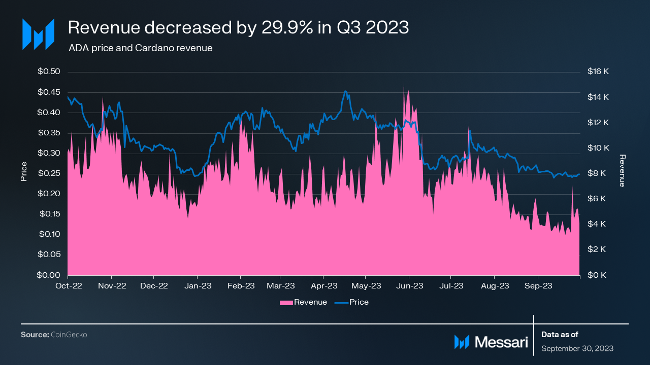 Q3’23 featured a largely quiet, sideways trading overall crypto market. The one major exception was a large selloff in mid-August. ADA’s price declined for the second consecutive quarter, down 9.5% QoQ to $0.25. This was generally in line with the overall crypto market, which fell 9.2% QoQ.