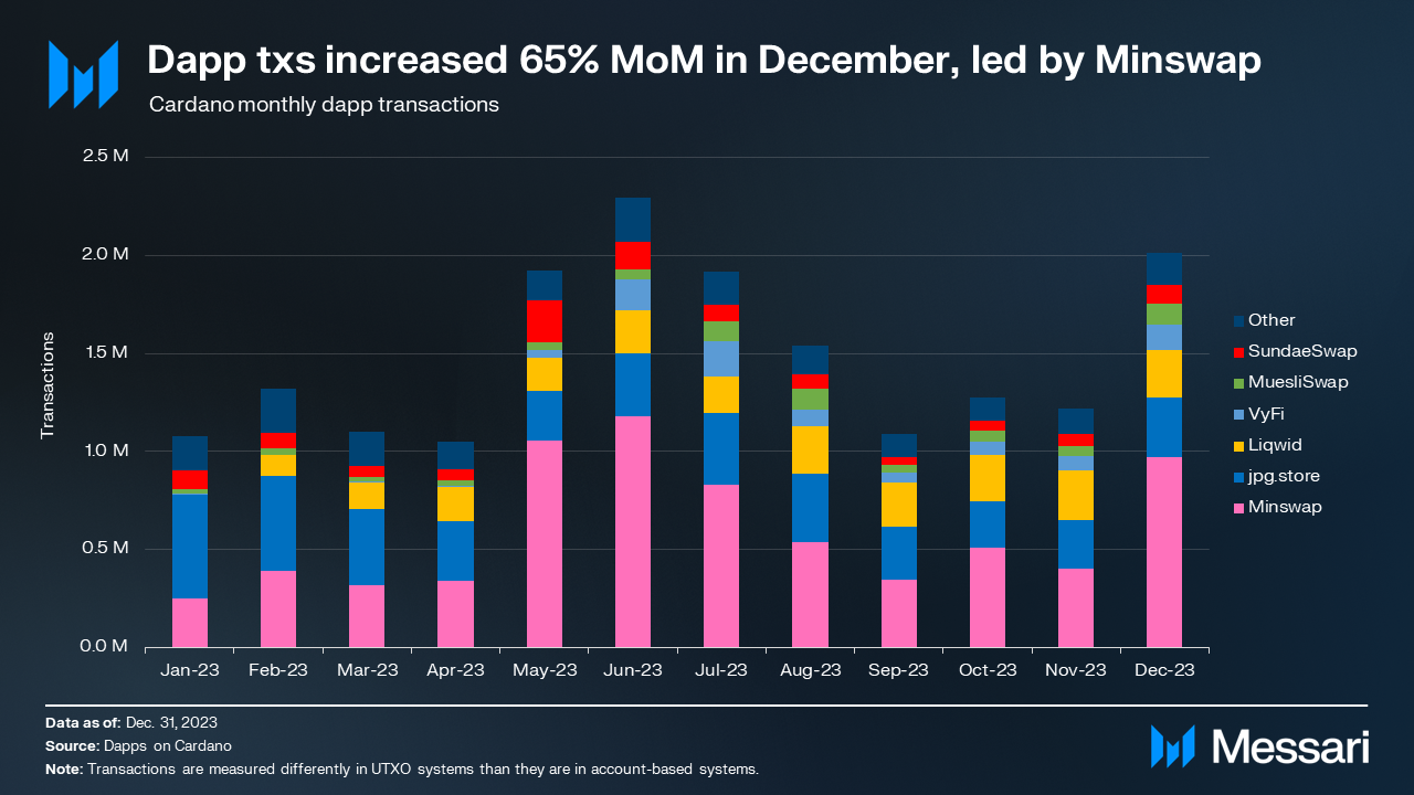 Early in 2023, Cardano’s TVL growth was catalyzed by the introduction of new stablecoins: iUSD and DJED. Stablecoins continued to be a good indicator for DeFi health in Q4 as the stablecoin total value locked increased 36.8% to $21.5 million. Relative to other networks, Cardano’s stablecoin market cap moved up from 54th to 32nd in 2023. Stable assets are ideal for pairing in liquidity pools, borrowing and lending, creating leverage, and providing quick escapes from volatility — all of which are quite common in the crypto market.