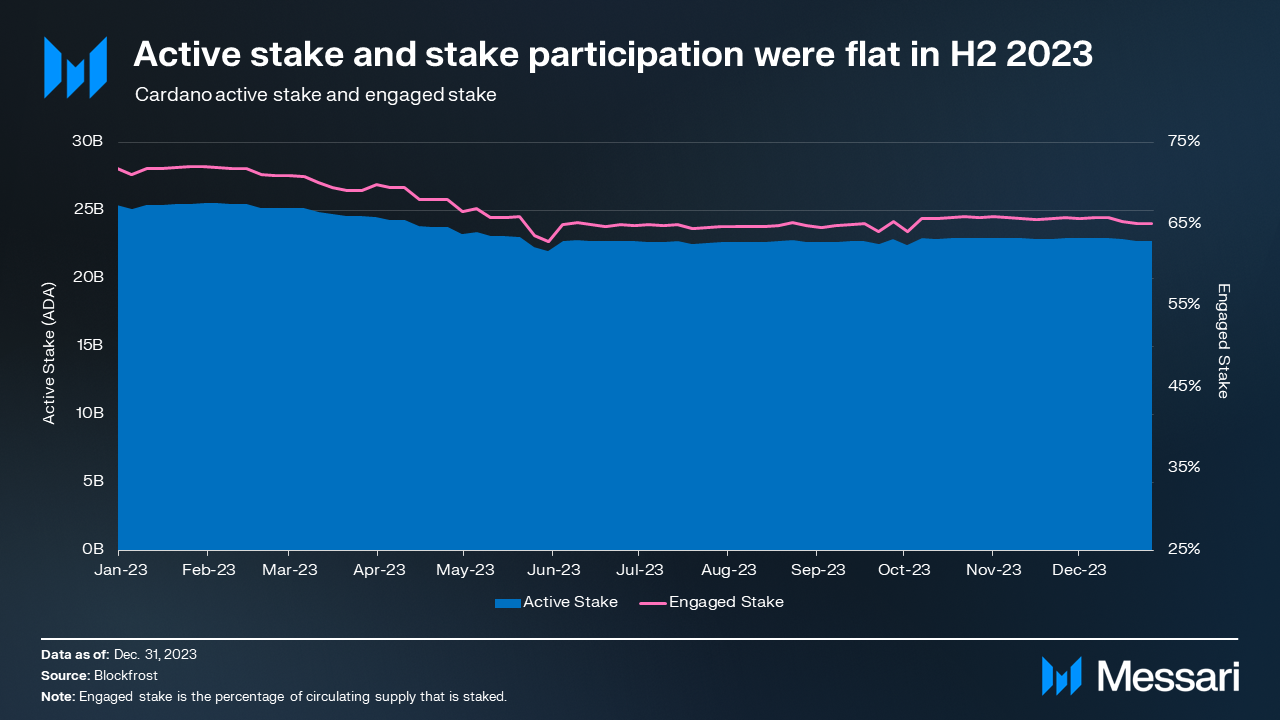Active stake was flat for the second quarter, declining 0.5% QoQ to 22.8 billion ADA. Engaged stake was similarly flat in the second half of 2023. However, active stake and engaged stake were both down YoY by 10.2% and 9.6%, respectively.
