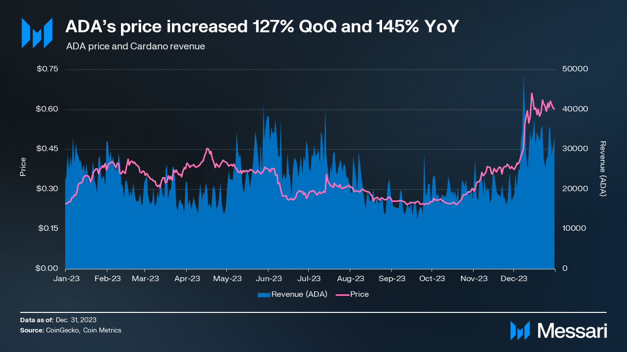 - ADA’s price increased 127.2% QoQ, outpacing the overall crypto market’s increase of 53.8%.