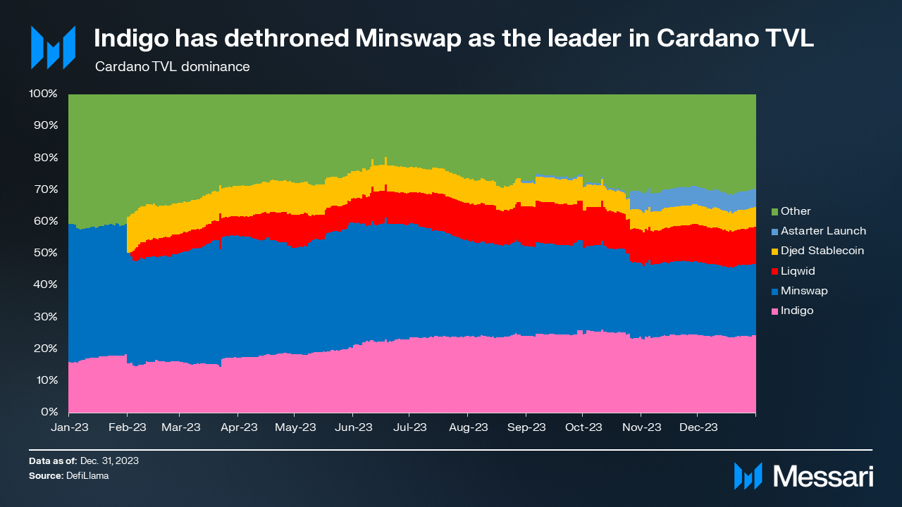 Much of the 2023 TVL growth was driven by newer protocols. Synthetic asset-issuer Indigo is the oldest and largest of these new (launched in the past year or so) protocols. It managed to dethrone Minswap in Q4, ending Minswap’s multi-year reign as the TVL leader.