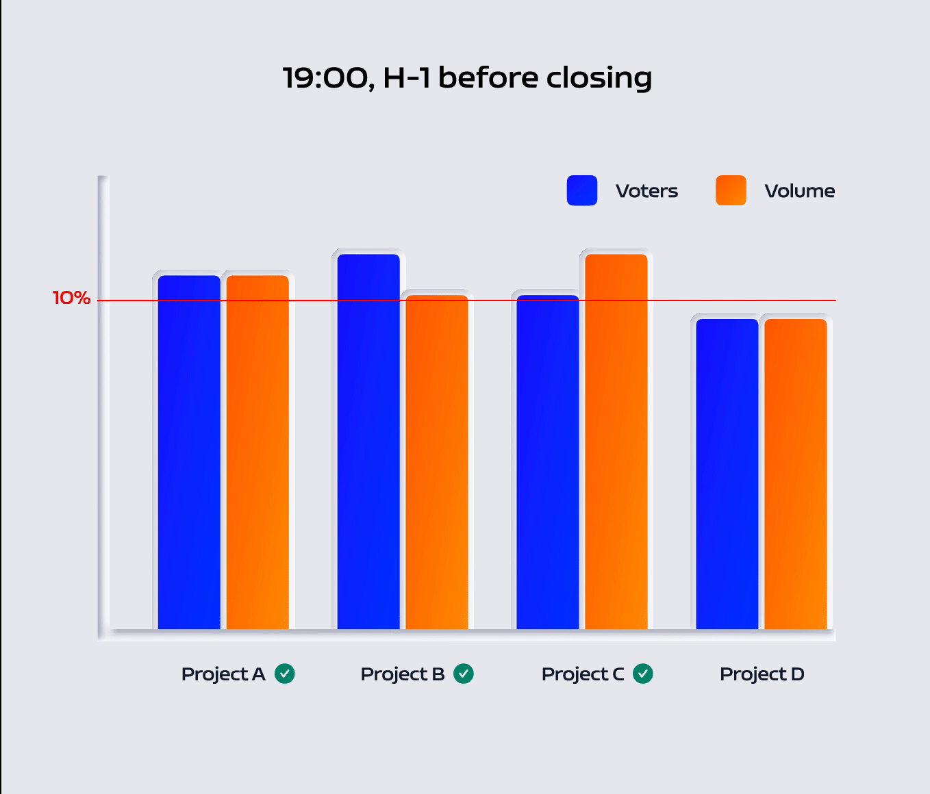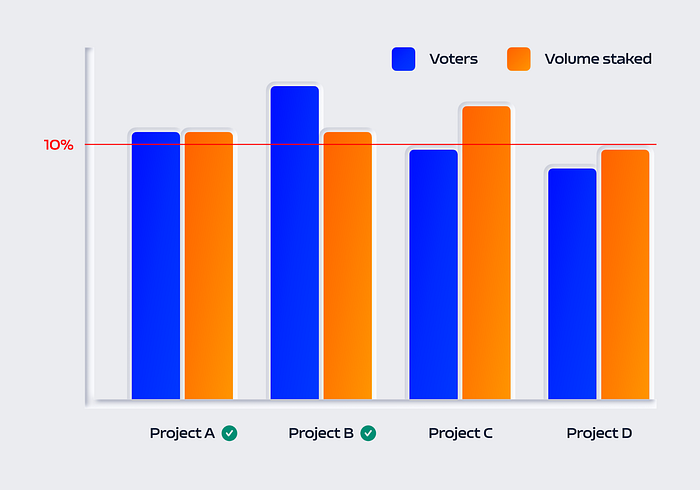 At the end of the staking period, projects that meet the percentage threshold for both of these metrics will be validated by the community and proceed to the next step.