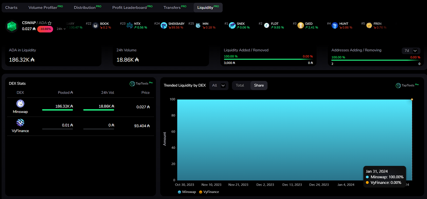 CSWAP currently has 186.32K ADA in liquidity on one Cardano DEX and a 24 hour volume of 18.86k ADA. CSWAPs liquidity is on the Minswap DEX, with a small portion previously being on the VyFinance DEX. There are currently 12 addresses providing liquidity for the CSWAP/ADA pairing.