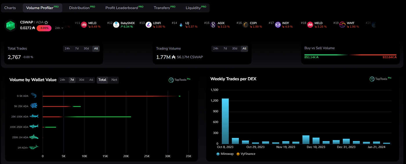 There have been 2.767 CSWAP trades amounting to a lifetime trading volume of 1.77 million ADA, equivalent to 56.17 Million CSWAP tokens. 851.14K of this was buy volume while 922.64k was sell volume. The majority of selling was done by the shrimp wallet size (0–5K ADA), while the majority of buying was done by the swordfish wallet size (25–100K ADA). Virtually all of the trading volume took place on the Minswap DEX.
