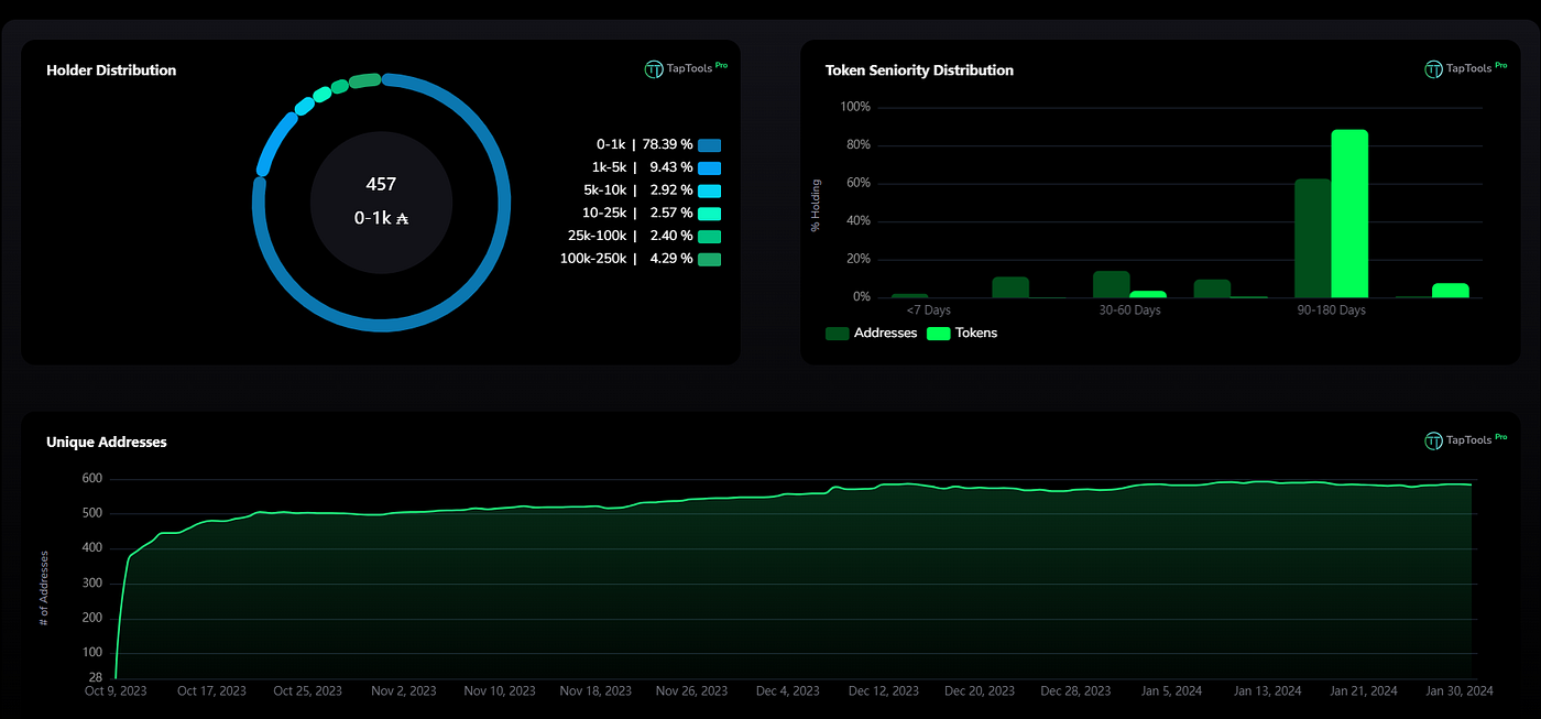 There are currently 584 holders of the token, up 1.57% in the last 30 days. CSwap has a Median Holder Balance of 3.4K tokens equivalent to 102.92 ADA, and an Average Holder Age of 86.99 days. Looking at the Token Seniority Distribution, a majority of these tokens have been held for 90–180 days, highlighting the project’s strong community.