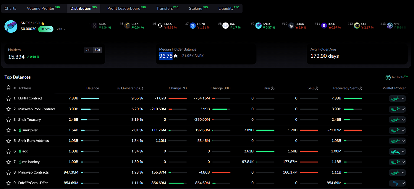 Snek has a total supply of 75.69 Billion tokens. Currently 73.24 Billion of these tokens are in circulation, equivalent to 96.8% of the total supply. At 0.000801 ₳ per Snek, this gives the total a circulating market cap of $22,022,512 and a fully diluted market cap of $22,759,376, placing it at #7 in the Top 50 on TapTools. Snek has a median holder balance of 121.95K Snek equivalent to 96.75 ADA, and an average holder age of 172.90 Days, highlighting a dedicated community that has supported the memecoin project since the start.
