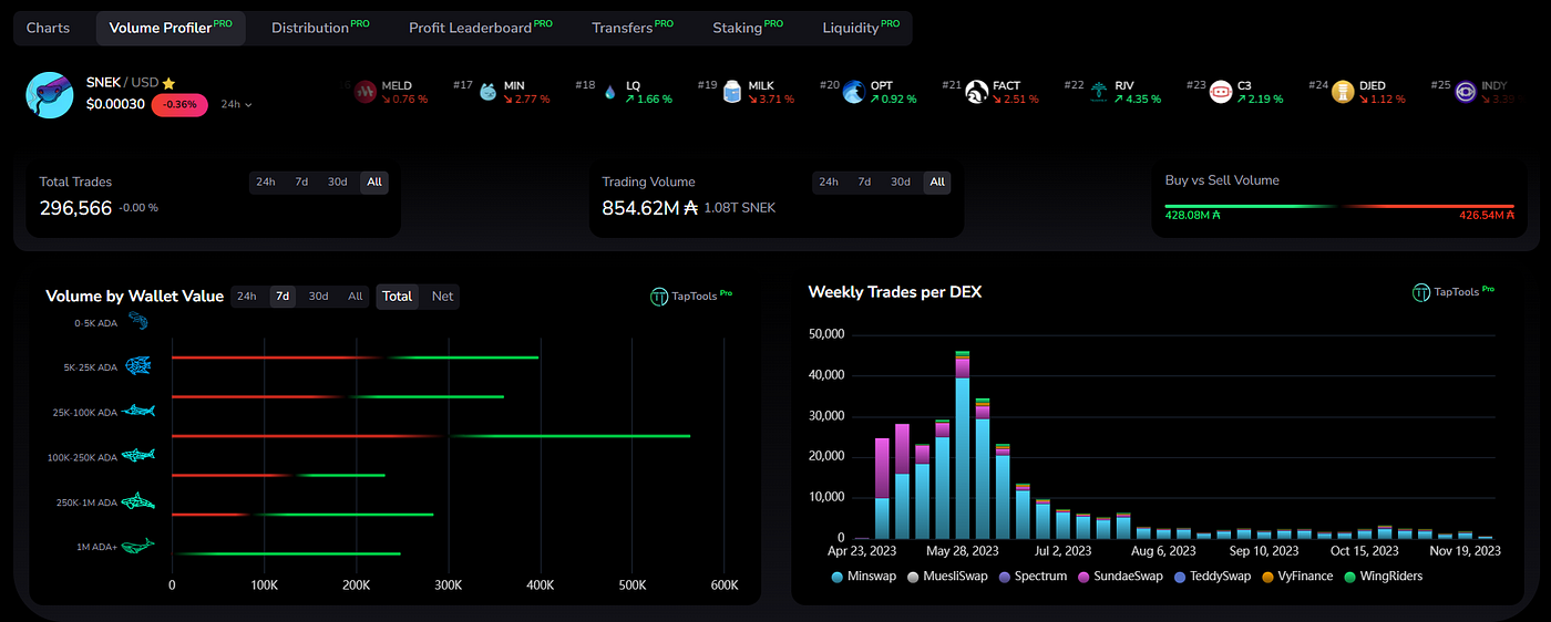 Snek has a lifetime trading volume of 854.62 Million ADA, equivalent to 1.08 Trillion Snek traded. Snek is the most traded Cardano Native token by far and has attracted holders from other ecosystems into Cardano. The token has 428.08 Million ADA in total buy volume and 426.54 Million ADA in total sell volume. The Majority of these trades have taken place on Minswap and SundaeSwap.
