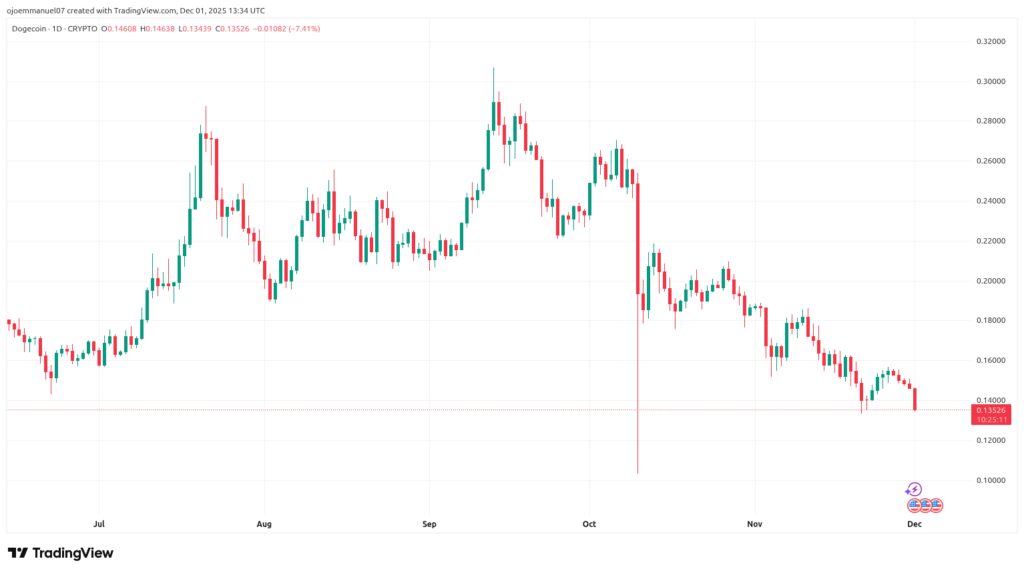 Dogecoin finds itself in a complicated position heading into the new year. Chain data shows whale transactions above $1 million have crashed from 285 to below 38 over the past two months. That has left retail traders carrying most of the activity, and retail traders rarely have enough capital to move markets on their own. DOGE has slipped from $0.27 down to the $0.13–$0.15 range, and the lack of heavyweight participation has kept price action sluggish. Even with some slow accumulation happening on spot markets, the changes haven’t been strong enough to reverse the broader downtrend.