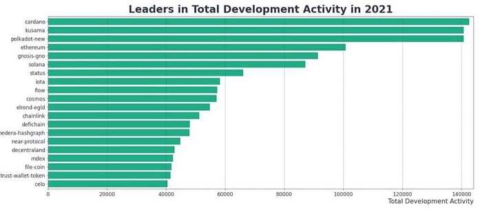 Cardano was the most developed L1 blockchain on github in 2021 (Fig. 8). Even though a lot of haters point the finger at Cardano, data doesn’t lie. Cardano has been the quietest blockchain before the smart contract was opened, but it’s not the most potential in 2022. It has been the most actively developed and lots of Dapps have announced that they will change the world.
