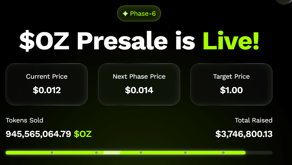 If OZ reaches its listing target of $1, that investment would grow to $333,333, turning a $4,000 investment into over $329,000 in profit—a massive 8,233% return. Already 945,562,398.51 $OZ tokens have been sold and raised over $3.74 million so far. If this phase ends, then the token price will be raised once again to $0.014. So the whales have the perfect chance to buy this AI token at the lowest cost.