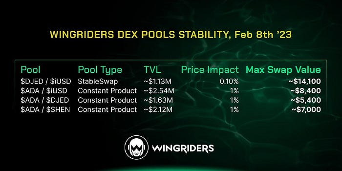 Constant sum pools and farms were deployed for $ADA/$SHEN and $ADA/DJED, extending the stablecoin pools and farms. Liquidity started pouring in thick and fast into all the new stablecoin and stable swap pools, enabling large trades with little price impact as shown below